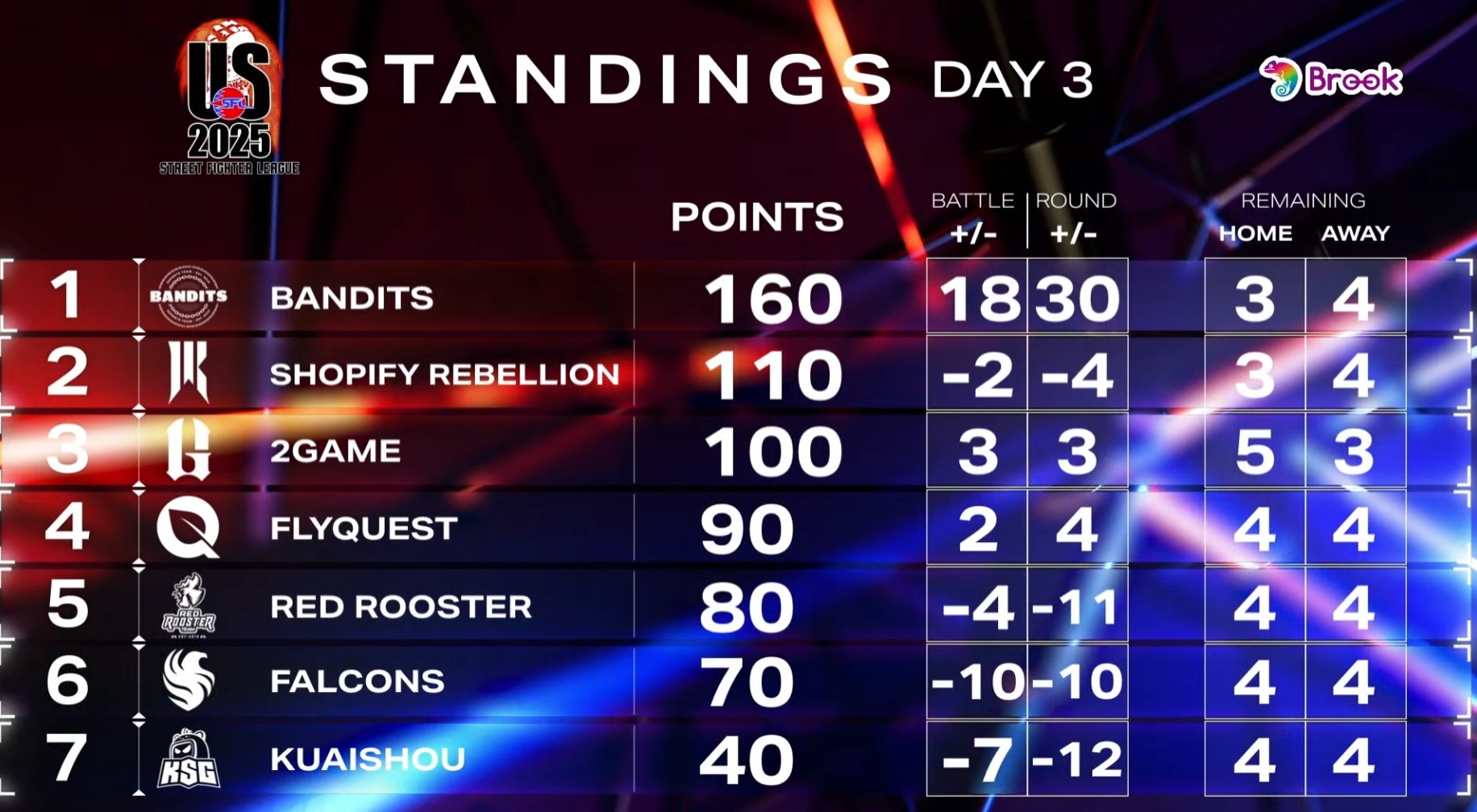 2GAME had one of the strongest starts in Street Fighter League US history with 40-0 shutouts in their first two Team Battles. In their last match of day two they took their first loss against FLYQUEST in a nailbiter, but they still came into day three at the top of the standings. After two days BANDITS was the lone remaining unbeaten team, although there were close calls, and they trailed 2GAME by 10 points. The other teams were not far behind and with plenty of Team Battles ahead going into day three.