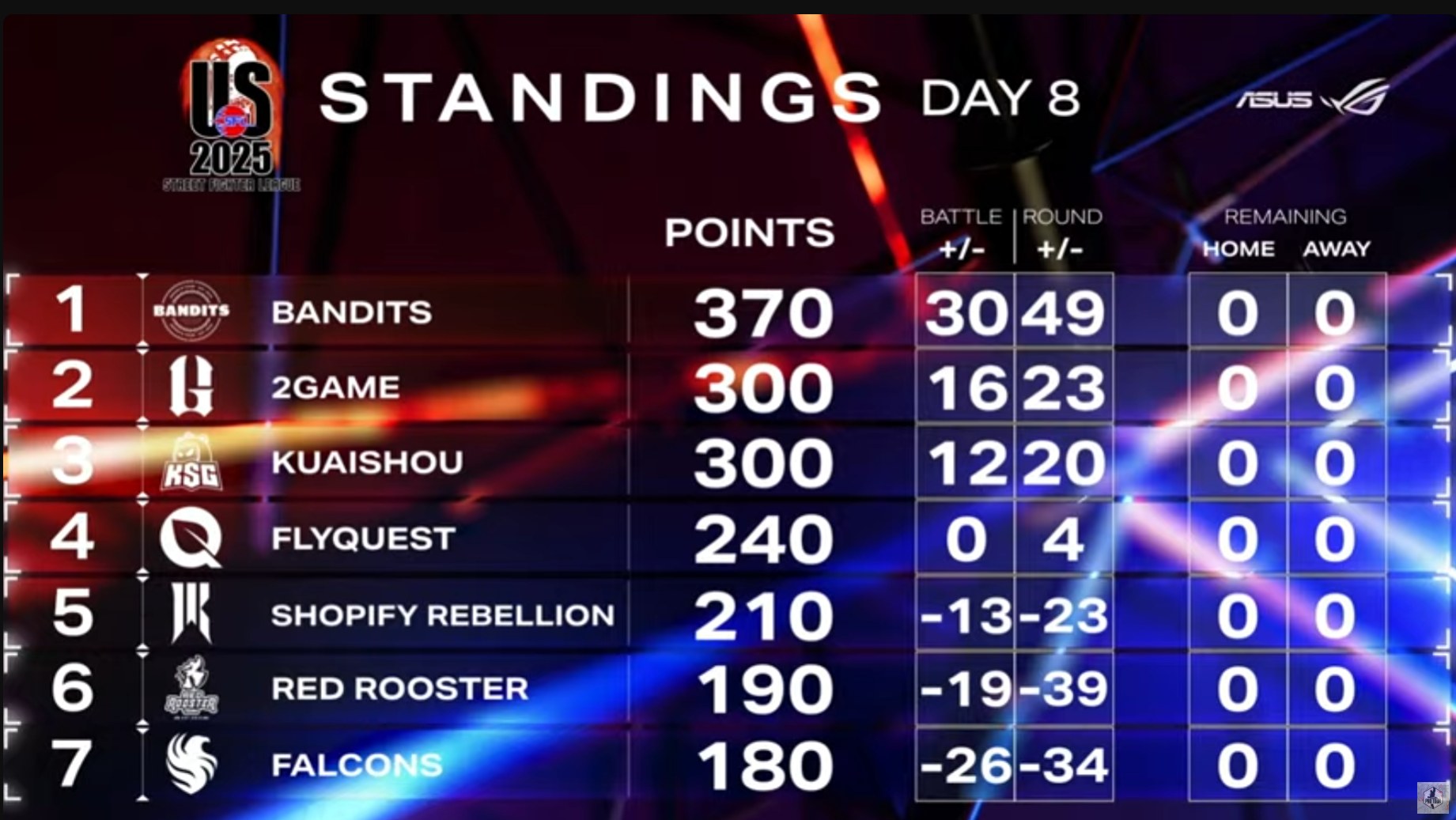 FLYQUEST took a tough shutout loss to KUAISHOU GAMING in day seven, but they rebounded in day eight, dishing out a 40-0 shutout against FALCONS. FALCONS put forth a valiant effort in this Team Battle despite the score, with the first two sets being very close. Riddles’ Terry defeated NL’s Akuma in the opening match 2-1 followed by Nephew’s Juri narrowly beating Xian’s Dee Jay 2-1. In the anchor match Punk’s Cammy came out on top over DCQ’s M.Bison 3-1.
